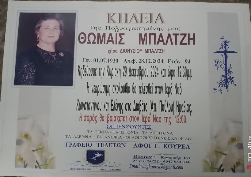Έφυγε από τη ζωή και κηδεύτηκε σήμερα Κυριακή 29 Δεκεμβρίου 2024 στις 12.30 μ.μ. από τον Ιερό Ναό Αγ. Κωνσταντίνου και Ελένης στο Διαβατό Ημαθίας η Θωμαϊς Μπαλτζή σε ηλικία 94 ετών.