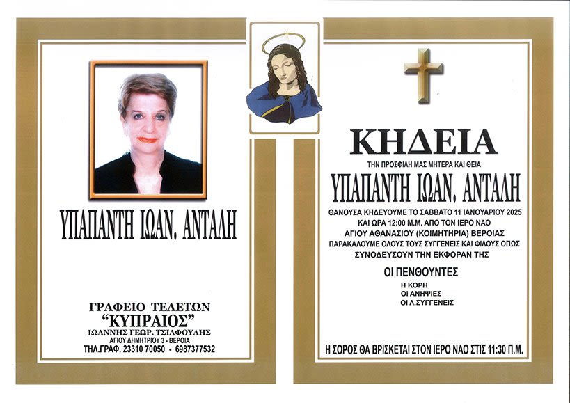 Έφυγε από τη ζωή και κηδεύεται το Σάββατο 11 Ιανουαρίου 2025 στις 12.00 μ.μ. από τον Ιερό Ναό Αγίου Αθανασίου (Κοιμητήρια) Βέροιας η Υπαπαντή Ιωαν. Ανταλή .