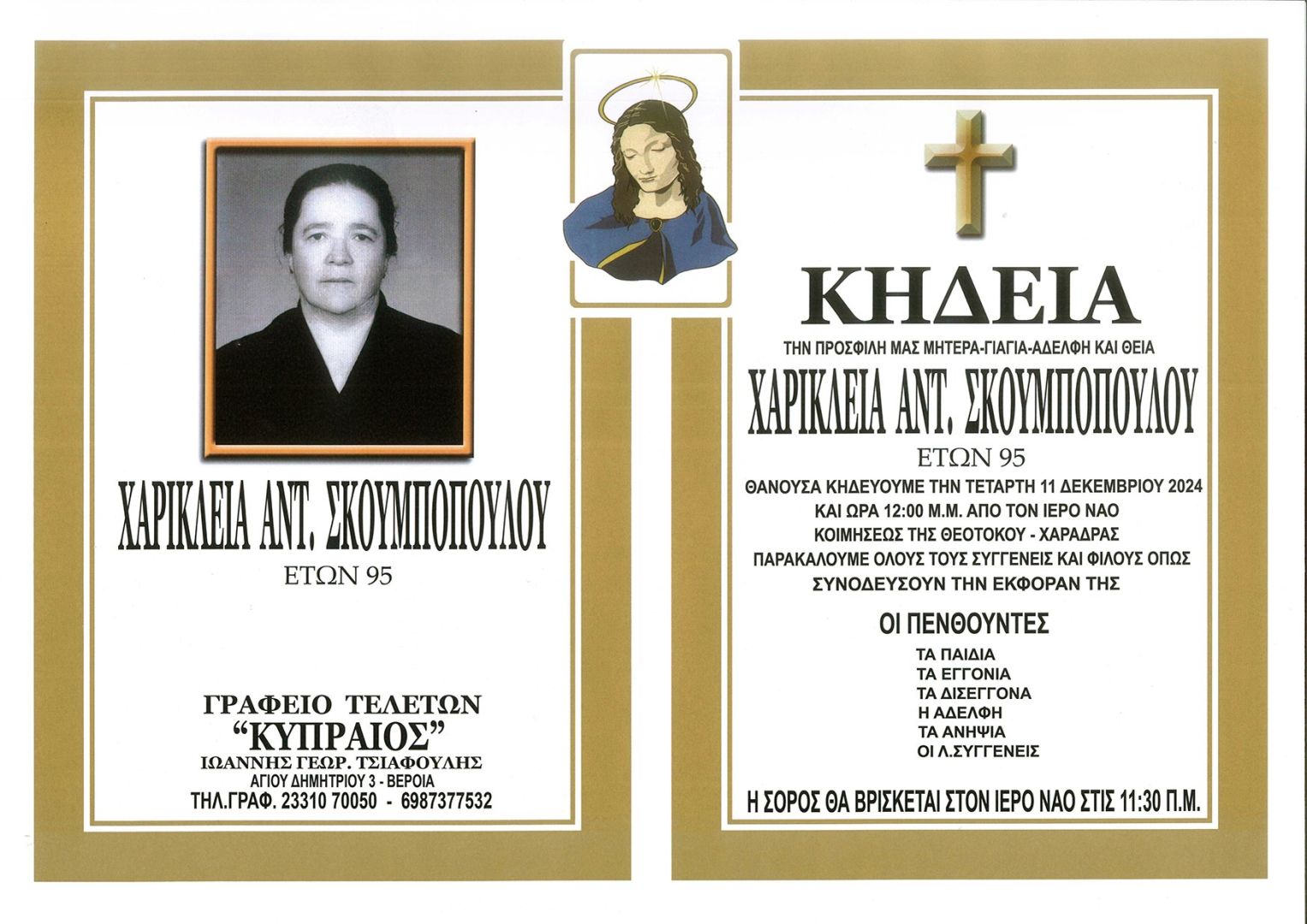 Έφυγε από τη ζωή και κηδεύεται την Τετάρτη 11 Δεκεμβρίου 2024 στις 12.00 μ.μ. από τον Ιερό Ναό Κοιμήσεως της Θεοτόκου Χαράδρας η Χαρίκλεια Αντ. Σκουμποπούλου σε ηλικία 95 ετών.