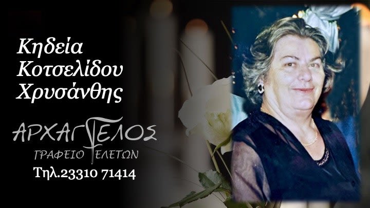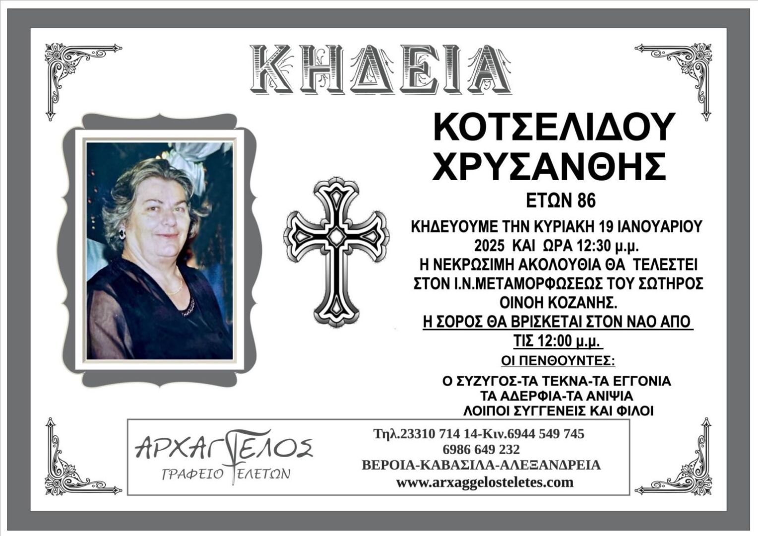 Έφυγε από τη ζωή και κηδεύεται την Κυριακή 19 Ιανουαρίου 2025 στις 12.30 μ.μ. από τον Ιερό Ναό Μεταμορφώσεως του Σωτήρος στην Οινόη Κοζάνης η Χρυσάνθη Κοτσελίδου σε ηλικία 86 ετών.