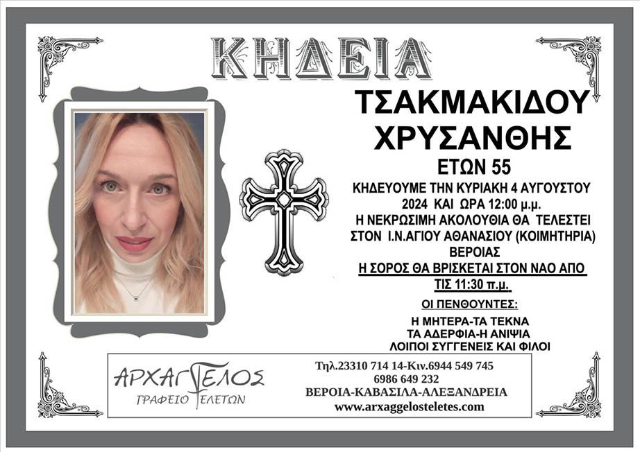 Έφυγε από τη ζωή και κηδεύεται αύριο Κυριακή 4 Αυγούστου 2024 στις 12.00 μ.μ. από τον Ιερό Ναό Αγίου Αθανασίου (Κοιμητήρια) Βέροιας η Χρυσάνθη Τσακμακίδου σε ηλικία 55 ετών.