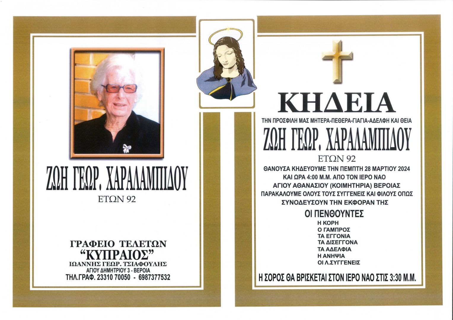 Έφυγε από τη ζωή και κηδεύεται την Πέμπτη 28 Μαρτίου 2024 στις 4.00 μ.μ. από τον Ιερό Ναό Αγίου Αθανασίου (Κοιμητήρια) Βέροιας η Ζωή Γεωρ. Χαραλαμπίδου σε ηλικία 92 ετών.