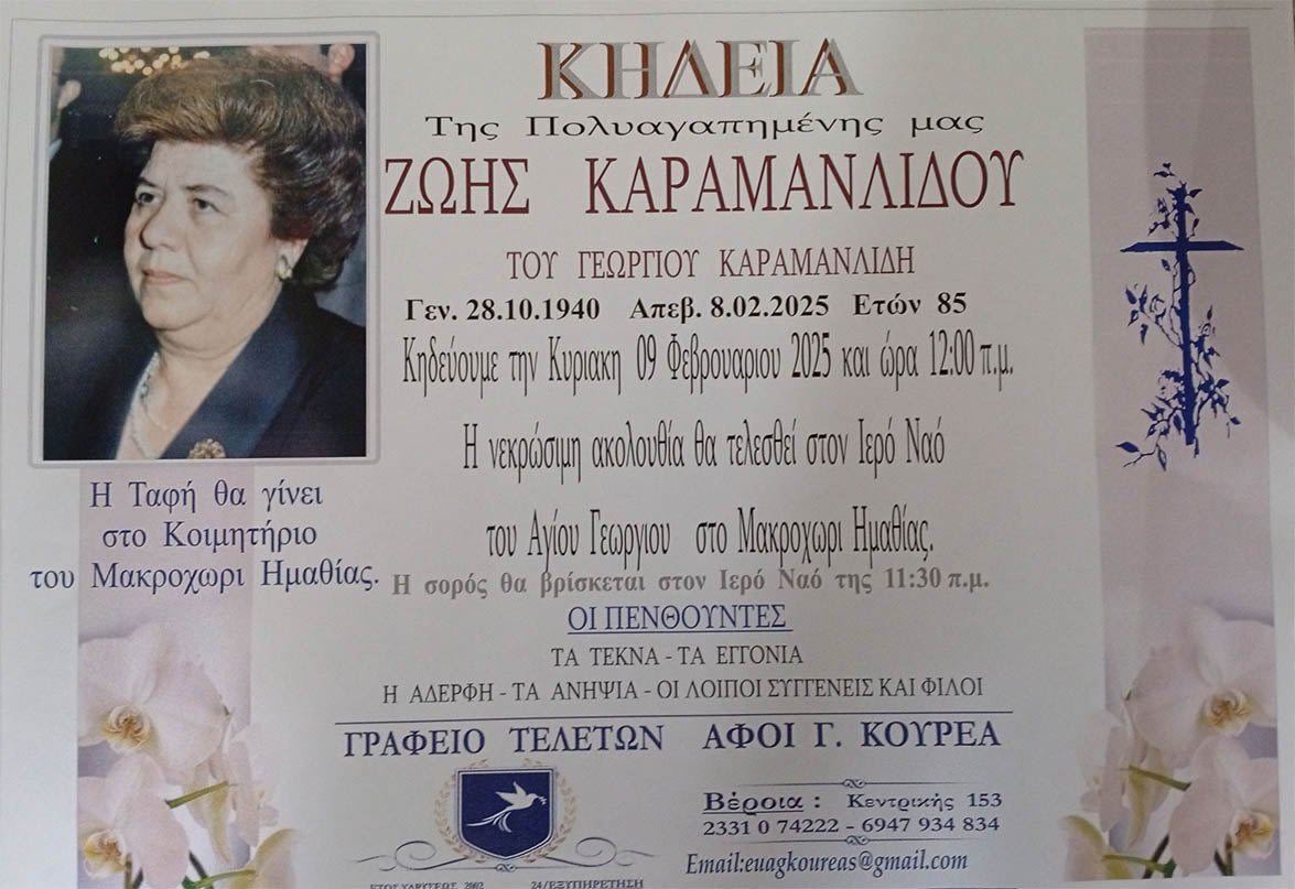 Έφυγε από τη ζωή και κηδεύτηκε την Κυριακή 9 Φεβρουαρίου 2025 στις 12.00 μ.μ. από τον Ιερό Ναό Αγίου Γεωργίου στο Μακροχώρι Ημαθίας η Ζωή Καραμανλίδου σε ηλικία 85 ετών.