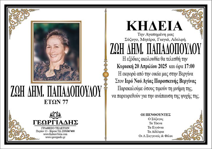 Έφυγε από τη ζωή και κηδεύεται σήμερα Κυριακή 20 Απριλίου 2025 στις 5.00 μ.μ. από τον Ιερό Ναό Αγίας Παρασκευής Βεργίνας η Ζωή Δημ. Παπαδοπούλου σε ηλικία 77 ετών.