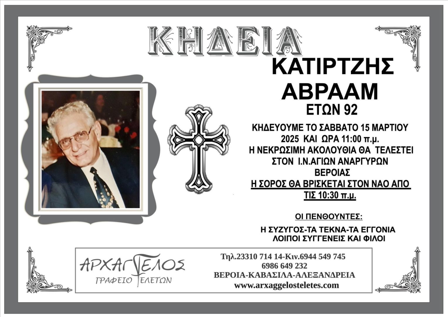Έφυγε από τη ζωή και κηδεύεται το Σάββατο 15 Μαρτίου 2025 στις 11.00 π.μ. από τον Ιερό Ναό Αγίων Αναργύρων Βέροιας ο Αβραάμ Κατιρτζής σε ηλικία 92 ετών.