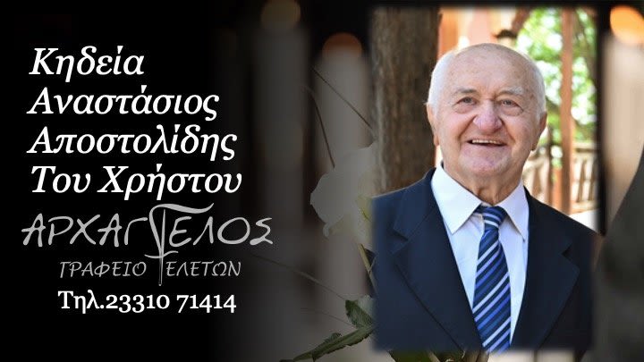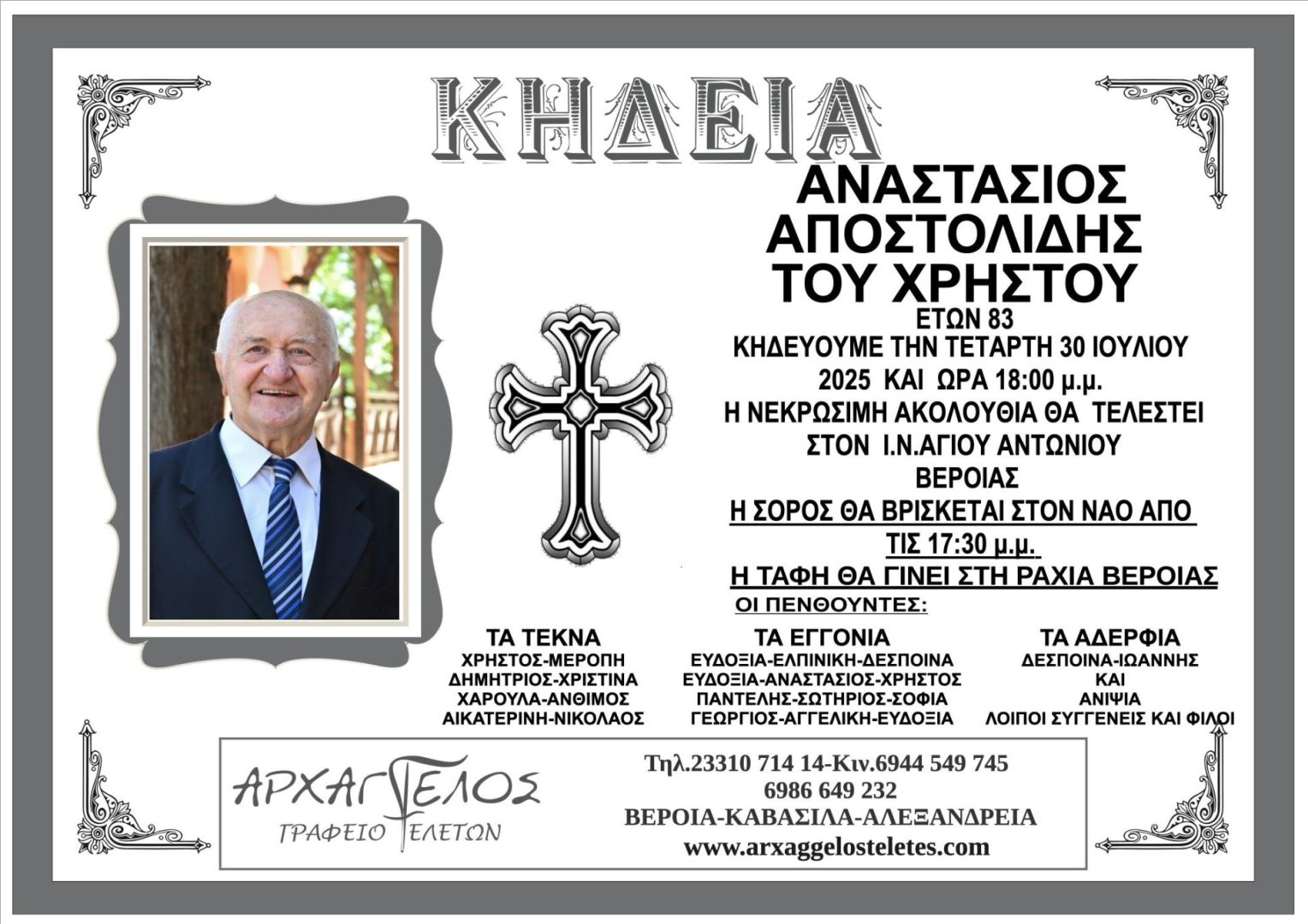 Έφυγε από τη ζωή και κηδεύεται την Τετάρτη 30 Ιουλίου 2025 στις 6.00 μ.μ. από τον Ιερό Ναό Αγίου Αντωνίου Βέροιας ο Αναστάσιος Αποστολίδης του Χρήστου σε ηλικία 83 ετών.