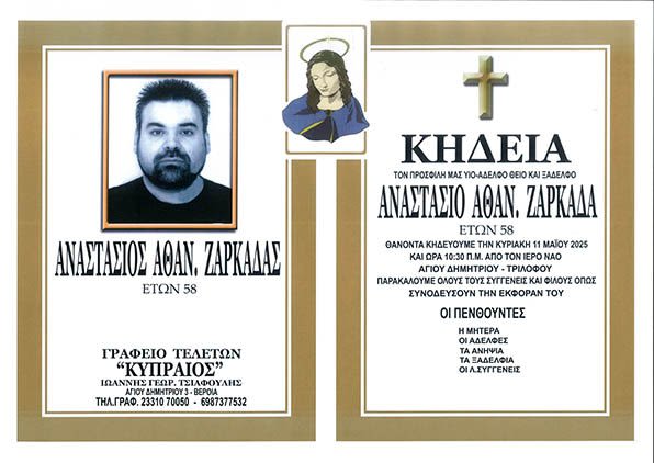 Έφυγε από τη ζωή και κηδεύεται αύριο Κυριακή 11 Μαΐου 2025 στις 10.30 π.μ. από τον Ιερό Ναό Αγίου Δημητρίου Τριλ΄όφου, ο Αναστάσιος Αθαν. Ζαρκάδας σε ηλικία 58 ετών.
