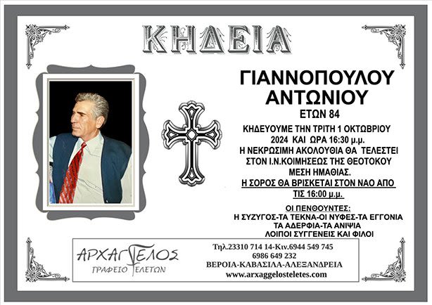 Έφυγε από τη ζωή και κηδεύεται σήμερα Τρίτη 1 Οκτωβρίου 2024 στις 4.30 μ.μ. από τον Ιερό Ναό Κοιμήσεως Της Θεοτόκου Μέση Ημαθίας, ο Αντώνης Γιαννόπουλος σε ηλικία 84 ετών.