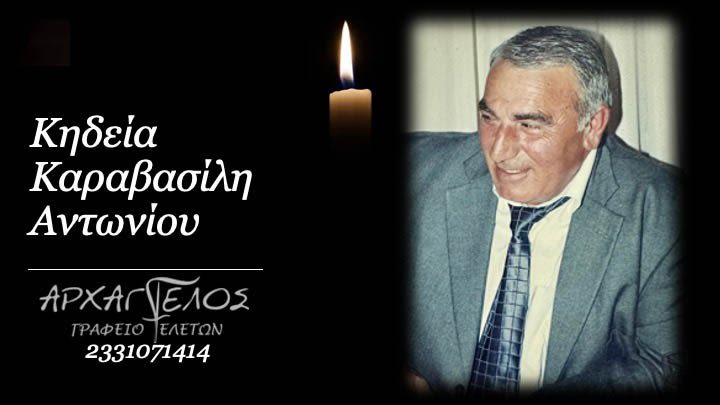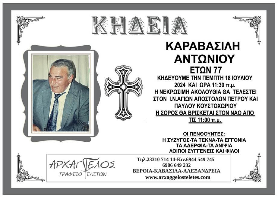 Έφυγε από τη ζωή και κηδεύεται την Πέμπτη 18 Ιουλίου 2024 στις 11.30 π.μ. από τον Ιερό Ναό Αγίων Αποστόλων Πέτρου και Παύλου Κουστοχωρίου ο Αντώνιος Καραβασίλης σε ηλικία 77 ετών.