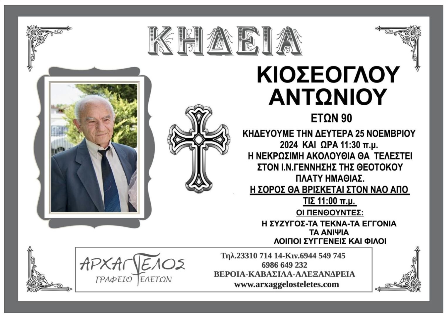 Έφυγε από τη ζωή και κηδεύεται την Δευτέρα 25 Νοεμβρίου 2024 στις 11.30 π.μ. από τον Ιερό Ναό Γέννησης της Θεοτόκου στο Πλατύ Ημαθίας ο Αντώνιος Κιοσέογλου σε ηλικία 90 ετών.