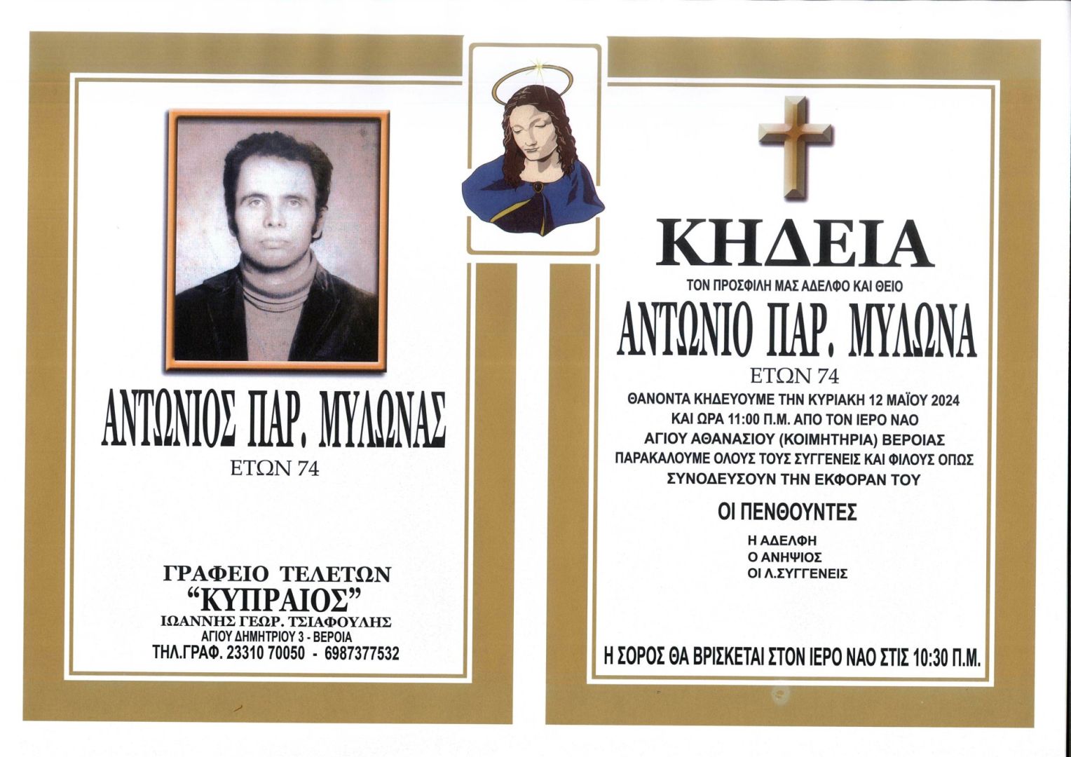Έφυγε από τη ζωή και κηδεύεται την Κυριακή 12 Μαΐου 2024 στις 11.00 π.μ. από τον Ιερό Ναό Αγίου Αθανασίου (Κοιμητήρια) Βέροιας ο Αντώνιος Παρ. Μυλωνάς σε ηλικία 74 ετών.