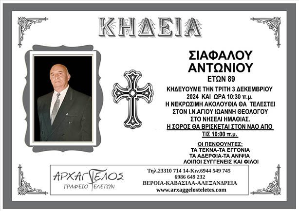 Έφυγε από τη ζωή και κηδεύεται αύριο Τρίτη 3 Δεκεμβρίου 2024 στις 10.30 π.μ. από τον Ιερό Ναό Αγίου Ιωάννη Θεολόγου στο Νησέλι Ημαθίας, ο Αντώνιος Σιάφαλος σε ηλικία 89 ετών.