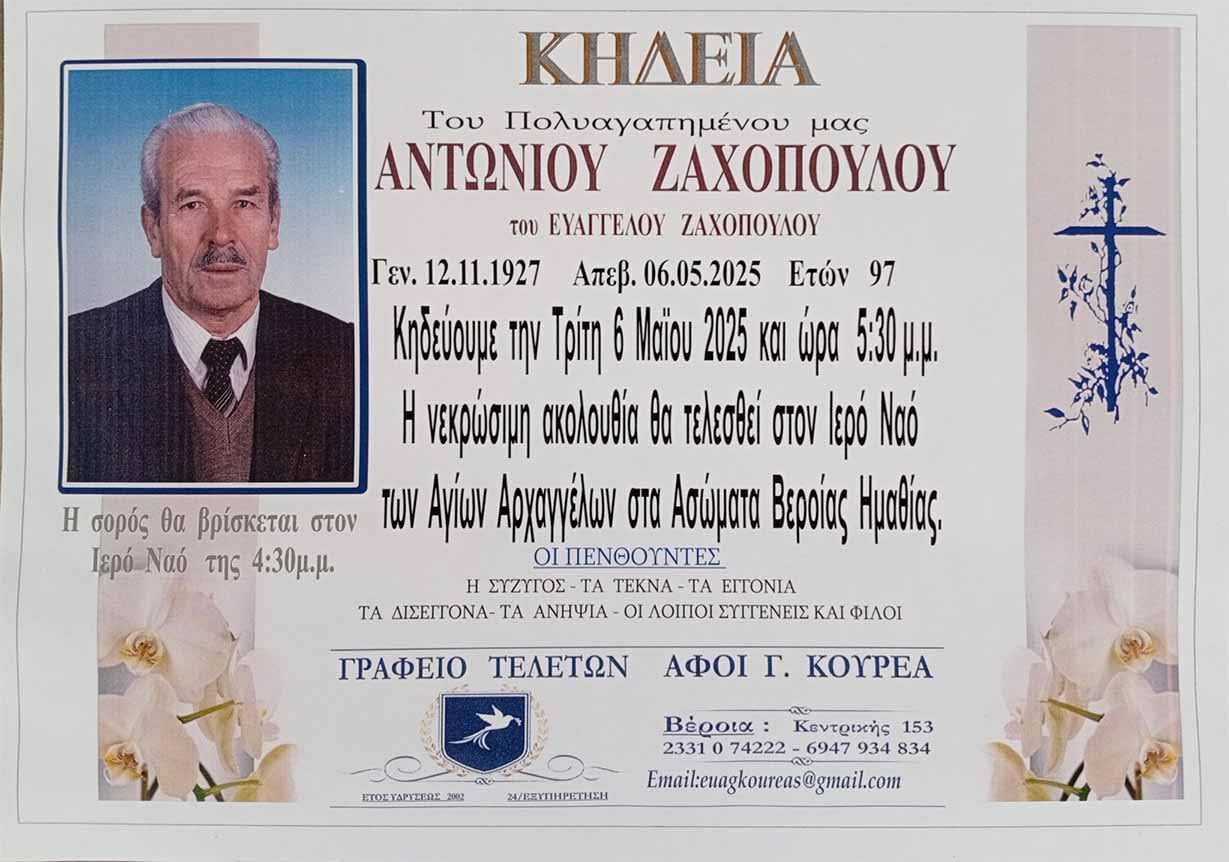 Έφυγε από τη ζωή και κηδεύεται σήμερα Τρίτη 6 Μαΐου 2025 στις 5.30 μ.μ. από τον Ιερό Ναό Αγίων Αρχαγγέλων στα Ασώματα Βέροιας ο Αντώνιος Ζαχόπουλος σε ηλικία 97 ετών.