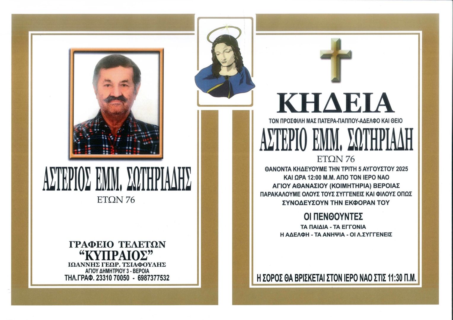 Έφυγε από τη ζωή και κηδεύεται την Τρίτη 5 Αυγούστου 2025 στις 12.00 μ.μ. από τον Ιερό Ναό Αγίου Αθανασίου (Κοιμητήρια) Βέροιας ο Αστέριος Εμμ. Σωτηριάδης σε ηλικία 76 ετών.