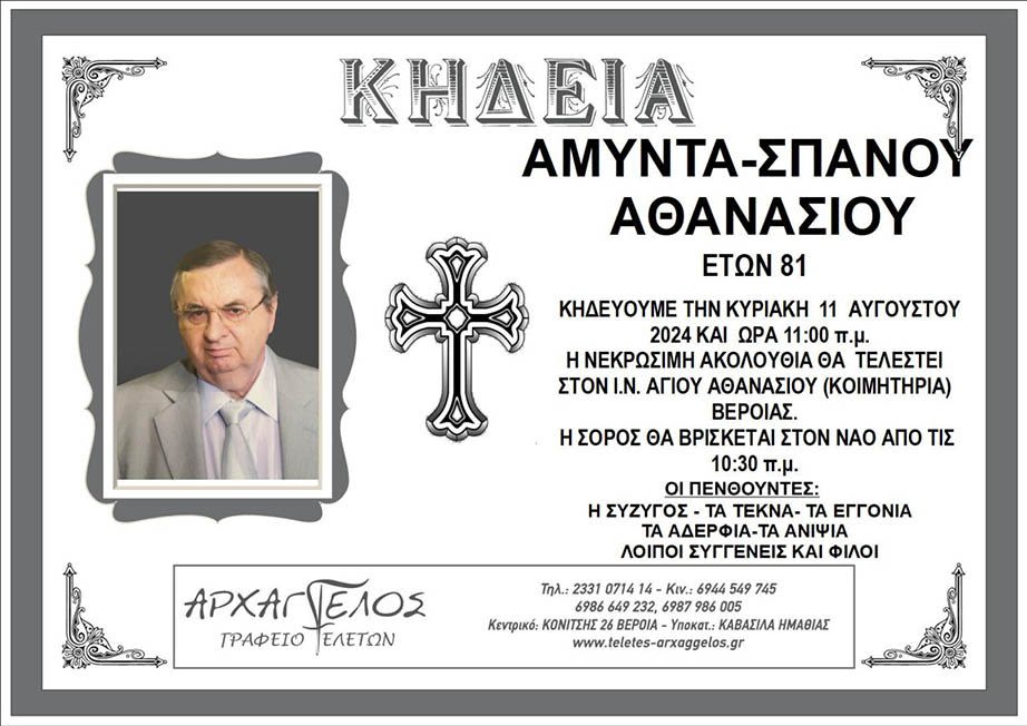 Έφυγε από τη ζωή και κηδεύεται αύριο Κυριακή 11 Αυγούστου 2024 στις 11.00 π.μ. από τον Ιερό Ναό Αγίου Αθανασίου (Κοιμητήρια) Βέροιας, ο Αθανάσιος Αμύντας Σπανός σε ηλικία 81 ετών.
