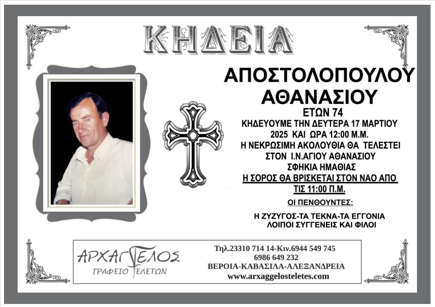 Έφυγε από τη ζωή και κηδεύτηκε την Δευτέρα 17 Μαρτίου 2025 στις 12.00 μ.μ. από τον Ιερό Ναό Αγίου Αθανασίου Σφηκιάς ο Αθανάσιος Αποστολόπουλος σε ηλικία 74 ετών.