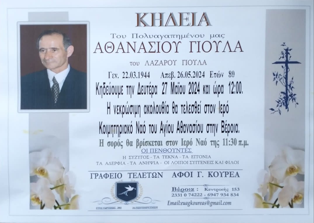 Έφυγε από τη ζωή και κηδεύεται σήμερα Δευτέρα 27 Μαΐου 2024 στις 12.00 μ.μ. από τον Ιερό Ναό Αγίου Αθανασίου (Κοιμητήρια) Βέροιας ο Αθανάσιος Γιούλας σε ηλικία 80 ετών.