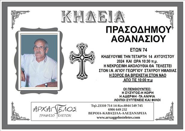 Έφυγε από τη ζωή και κηδεύεται την Τετάρτη 14 Αυγούστου 2024 στις 10.30 π.μ. από τον Ιερό Ναό Αγίου Γεωργίου Σταυρού Ημαθίας ο Αθανάσιος Πρασοδήμος σε ηλικία 74 ετών.