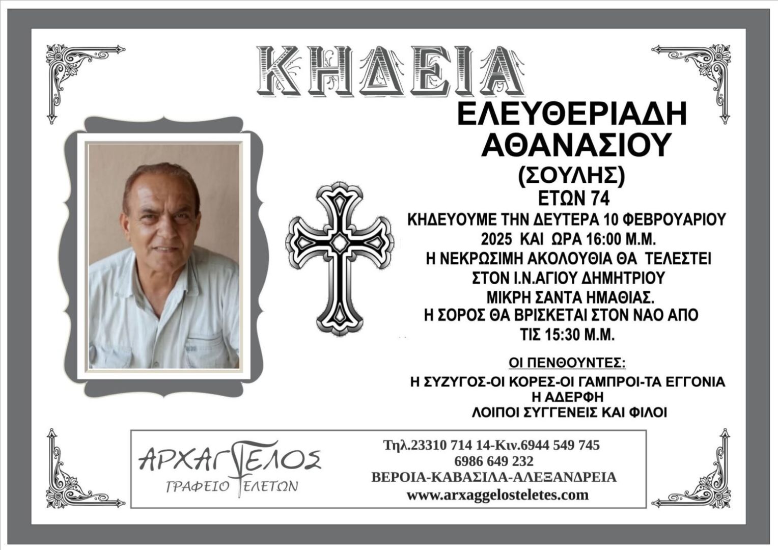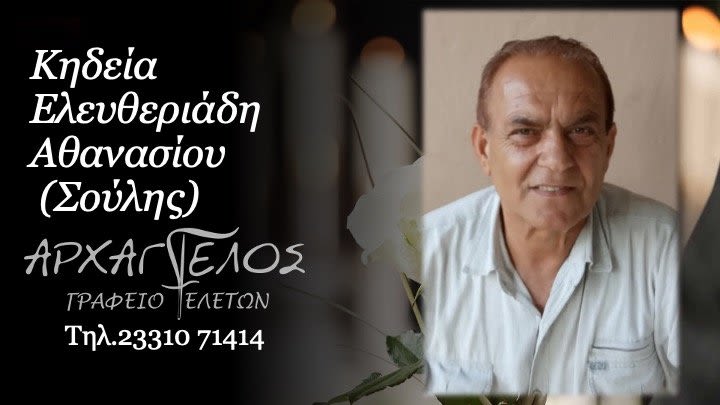 Έφυγε από τη ζωή και κηδεύεται την Δευτέρα 10 Φεβρουαρίου 2025 στις 4.00 μ.μ. από τον Ιερό Ναό Αγίου Δημητρίου στην Μικρή Σάντα Ημαθίας ο Αθανάσιος (Σούλης) Ελευθεριάδης σε ηλικία 74 ετών.