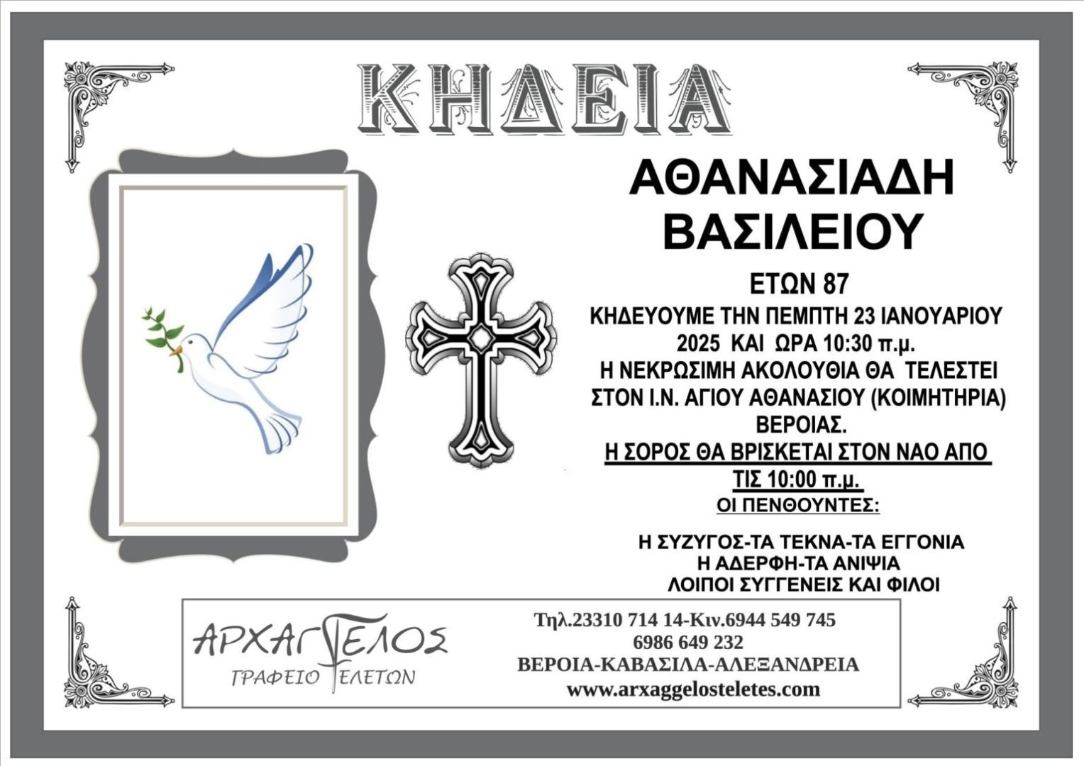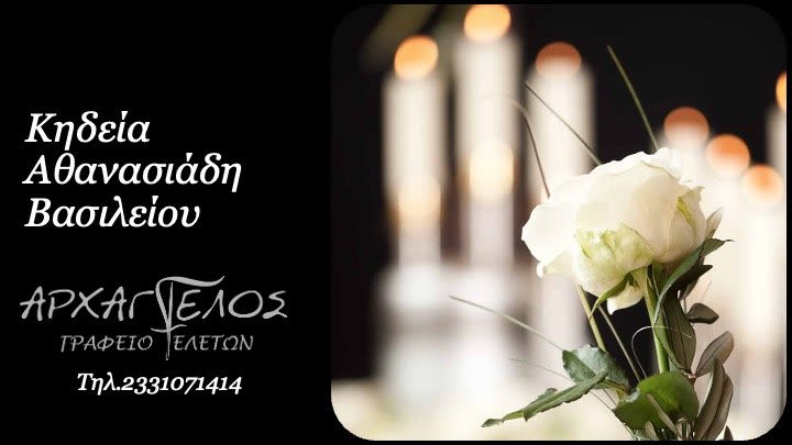 Έφυγε από τη ζωή και κηδεύεται την Πέμπτη 23 Ιανουαρίου 2025 στις 10.30 π.μ. από τον Ιερό Ναό Αγίου Αθανασίου (Κοιμητήρια) Βέροιας ο Βασίλειος Αθανασιάδης σε ηλικία 87 ετών.