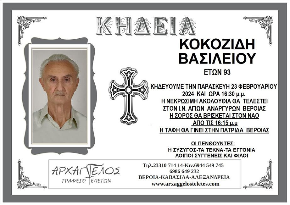 Έφυγε από τη ζωή και κηδεύεται σήμερα Παρασκευή 23 Φεβρουαρίου 2024 στις 4.30 μ.μ. από τον Ιερό Ναό Αγίων Αναργύρων Βέροιας ο Βασίλειος Κοκοζίδης σε ηλικία 93 ετών.