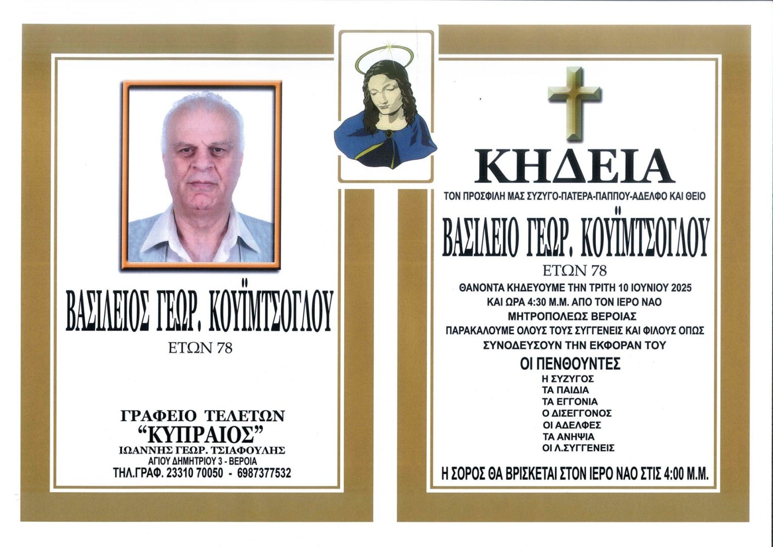 Έφυγε από τη ζωή και κηδεύεται την Τρίτη 10 Ιουνίου 2025 στις 4.30 μ.μ. από τον Ιερό Ναό Μητροπόλεως Βέροιας ο Βασίλειος Γεωρ. Κουϊμτσόγλου σε ηλικία 78 ετών.