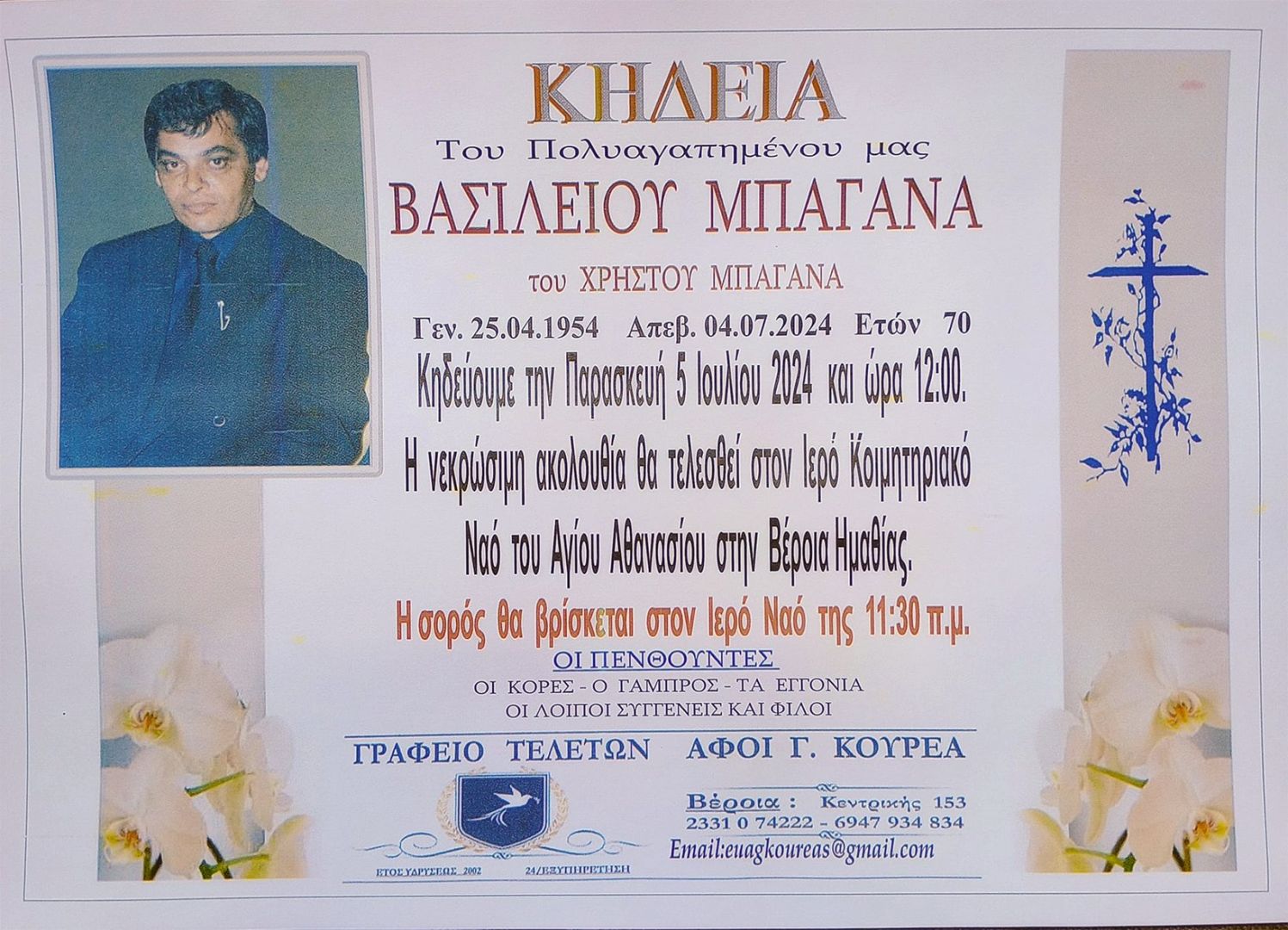 Έφυγε από τη ζωή και κηδεύτηκε σήμερα Παρασκευή 5 Ιουλίου 2024 στις 12.00 μ.μ. από τον Ιερό Ναό Αγίου Αθανασίου (Κοιμητήρια) Βέροιας ο Βασίλειος Χρ. Μπαγανας σε ηλικία 70 ετών.