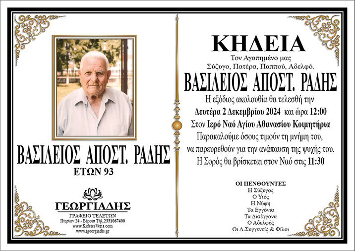Έφυγε από τη ζωή και κηδεύεται την Δευτέρα 2 Δεκεμβρίου 2024 στις 12.00 μ.μ. από τον Ιερό Ναό Αγίου Αθανασίου (Κοιμητήρια) Βέροιας ο Βασίλειος Αποστ. Ράδης σε ηλικία 93 ετών.