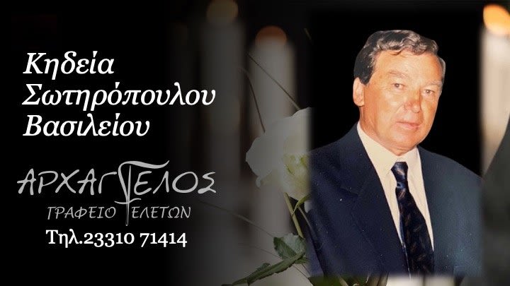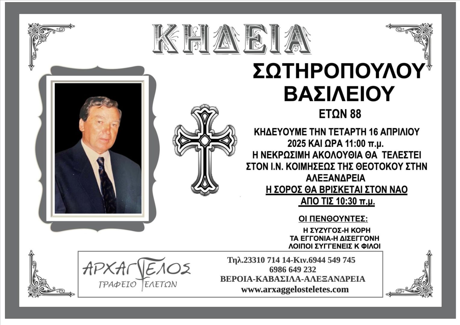 Έφυγε από τη ζωή και κηδεύεται την Μ. Τετάρτη 16 Απριλίου 2025 στις 11.00 π.μ. από τον Ιερό Ναό Κοιμήσεως της Θεοτόκου Αλεξάνδρειας ο Βασίλειος Σωτηρόπουλος σε ηλικία 88 ετών.
