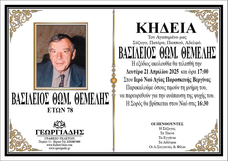 Έφυγε από τη ζωή και κηδεύεται σήμερα Δευτέρα 21 Απριλίου 2025 στις 5.00 μ.μ. από τον Ιερό Ναό Αγίας Παρασκευής Βεργίνας ο Βασίλειος Θωμ. Θεμελής σε ηλικία 78 ετών.