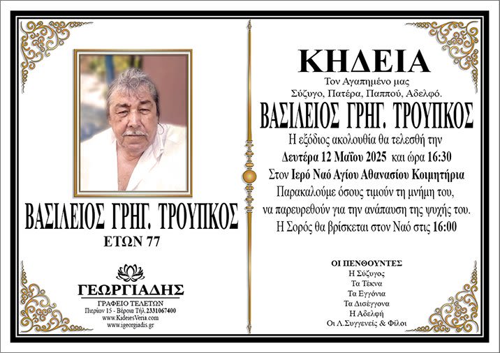Έφυγε από τη ζωή και κηδεύεται την Δευτέρα 12 Μαΐου 2025 στις 4.30 μ.μ. από τον Ιερό Ναό Αγίου Αθανασίου (Κοιμητήρια) Βέροιας ο Βασίλειος Γρηγ. Τρούπκος σε ηλικία 77 ετών.
