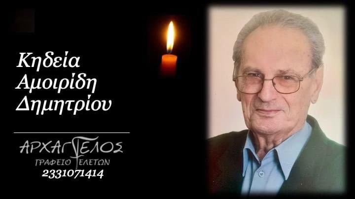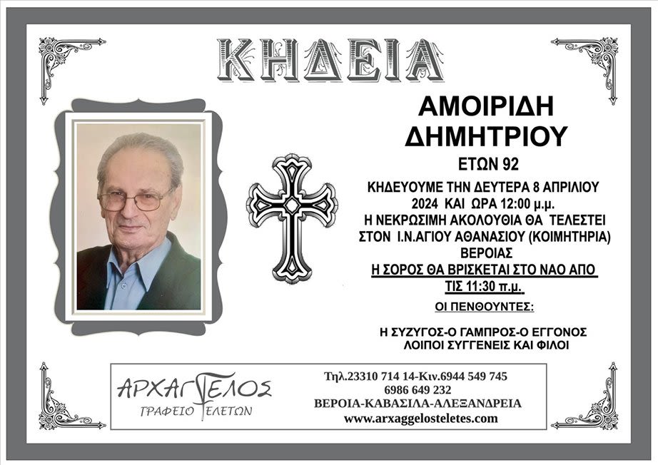Έφυγε από τη ζωή και κηδεύεται την Δευτέρα 8 Απριλίου 2024 στις 12.00 μ.μ. από τον Ιερό Ναό Αγίου Αθανασίου (Κοιμητήρια) Βέροιας ο Δημήτριος Αμοιρίδης σε ηλικία 92 ετών.