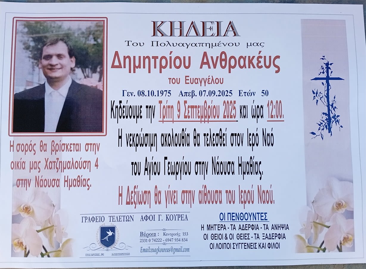 Έφυγε από τη ζωή και κηδεύεται την Τρίτη 9 Σεπτεμβρίου 2025 στις 12.00 μ.μ. από τον Ιερό Ναό Αγίου Γεωργίου στη Νάουσα Ημαθίας ο Δημήτριος Ευαγγ. Ανθρακεύς σε ηλικία 50 ετών.
