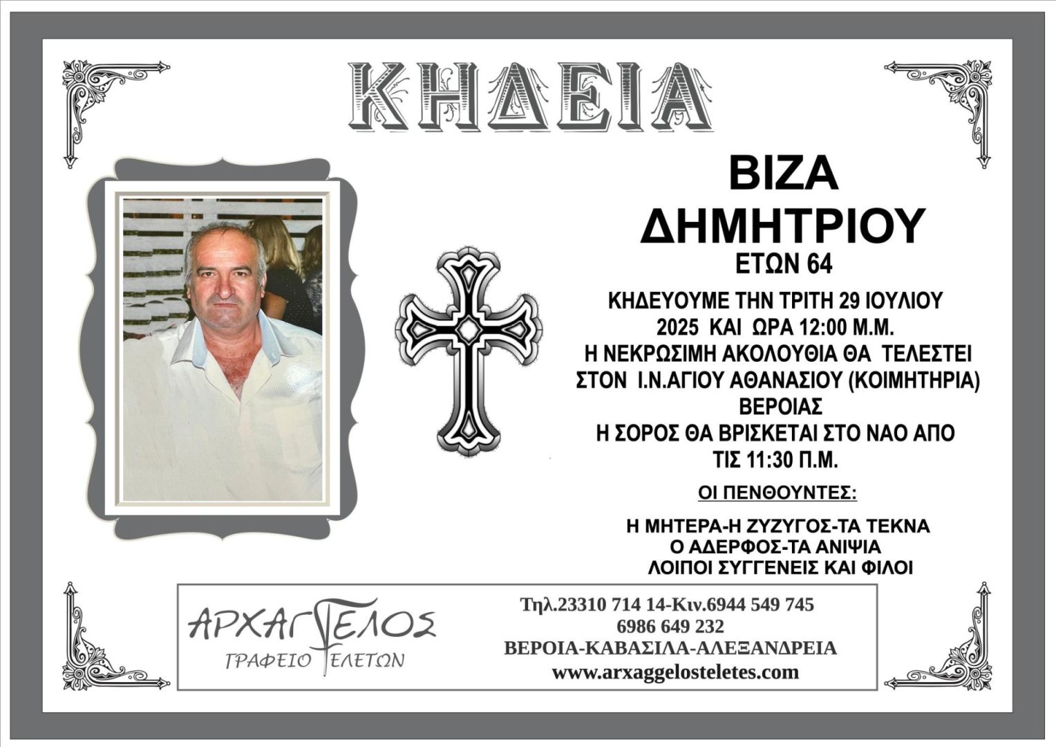Έφυγε από τη ζωή και κηδεύεται την Τρίτη 29 Ιουλίου 2025 στις 12.00 μμ. από τον Ιερό Ναό Αγίου Αθανασίου (Κοιμητήρια) Βέροιας ο Δημήτριος Βίζας σε ηλικία 64 ετών.
