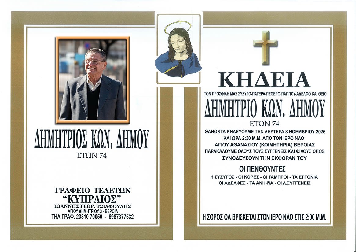 Έφυγε από τη ζωή και κηδεύεται την Δευτέρα 3 Νοεμβρίου 2025 στις 2.30 μ.μ. από τον Ιερό Ναό Αγίου Αθανασίου (Κοιμητήρια) Βέροιας ο Δημήτριος Κων. Δήμου σε ηλικία 74 ετών.