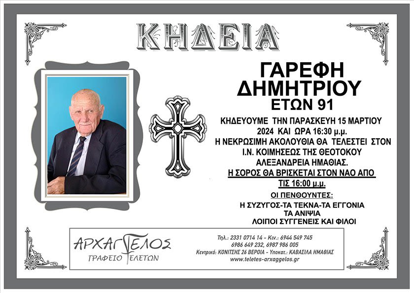 Έφυγε από τη ζωή και κηδεύεται σήμερα Παρασκευή 15 Μαρτίου 2024 στις 4.30 μ.μ. από τον Ιερό Ναό Κοιμήσεως της Θεοτόκου στην Αλεξάνδρεια Ημαθίας ο Δημήτριος Γαρέφης σε ηλικία 91 ετών.