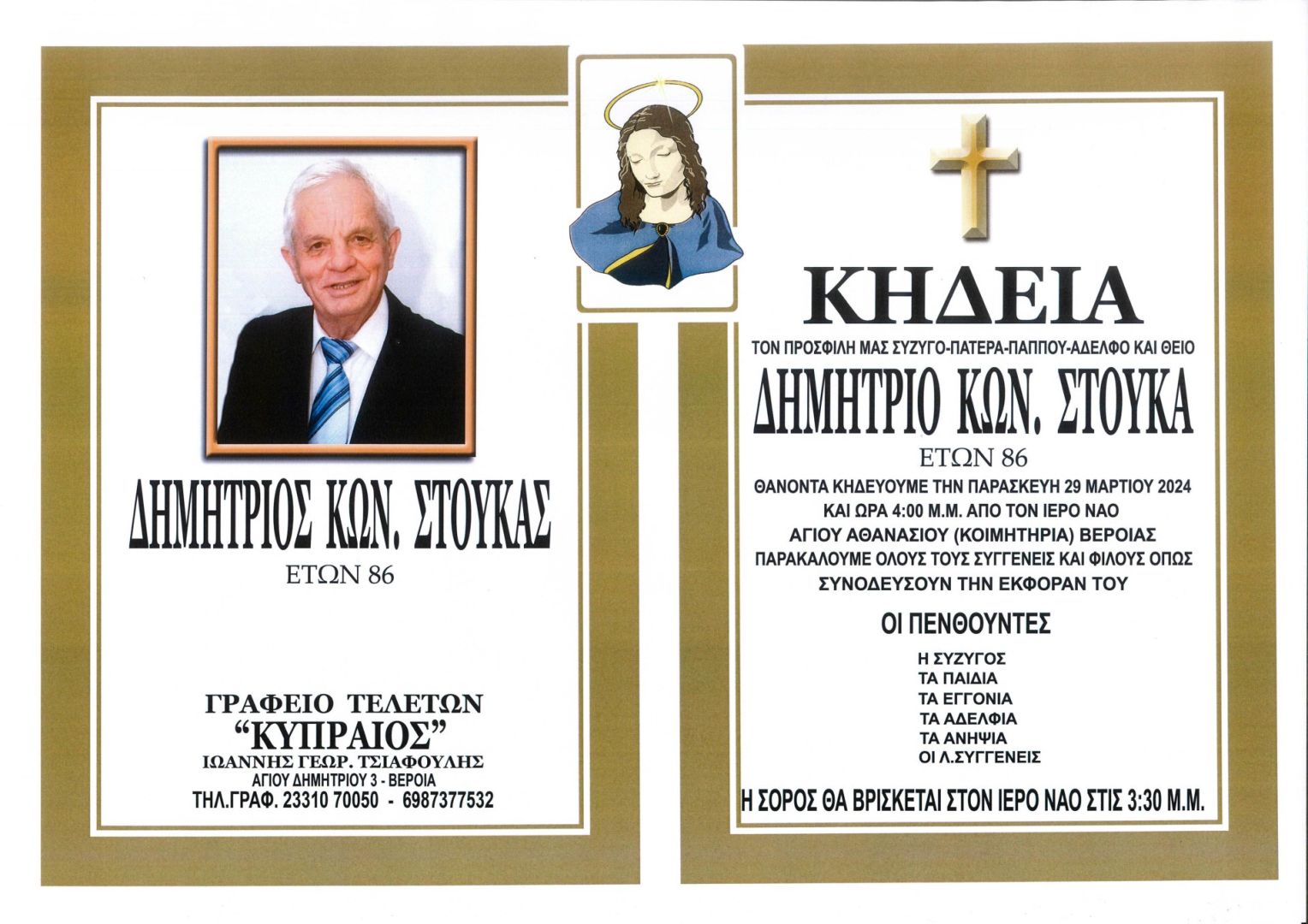 Έφυγε από τη ζωή και κηδεύεται την Παρασκευή 29 Μαρτίου 2024 στις 4.00 μ.μ. από τον Ιερό Ναό Αγίου Αθανασίου (Κοιμητήρια) Βέροιας ο Δημήτριος Κων. Στούκας σε ηλικία 86 ετών.