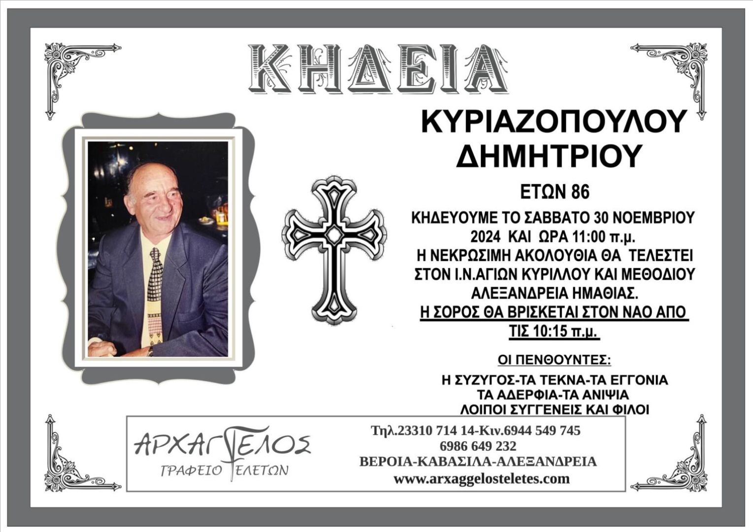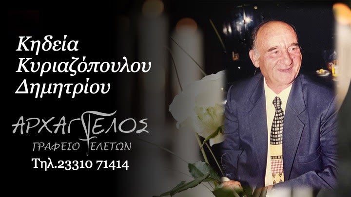 Έφυγε από τη ζωή και κηδεύεται το Σάββατο 30 Νοεμβρίου 2024 στις 11.00 π.μ. από τον Ιερό Ναό Αγίων Κυρίλλου και Μεθοδίου Αλεξάνδρειας Ημαθίας ο Δημήτριος Κυριαζόπουλος σε ηλικία 86 ετών.