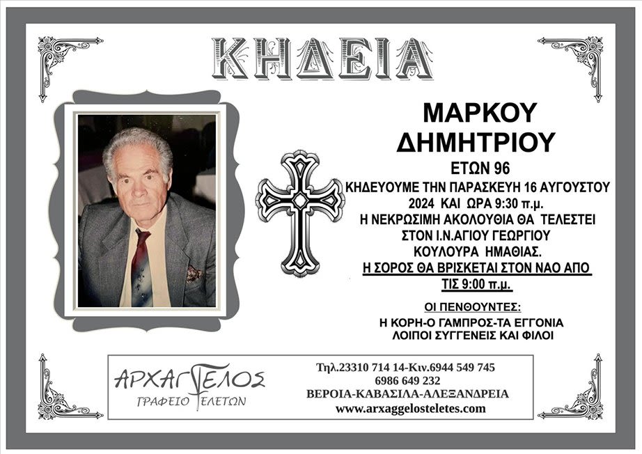 Έφυγε από τη ζωή και κηδεύεται την Παρασκευή 16 Αυγούστου 2024 στις 9.30 π.μ. από τον Ιερό Ναό Αγίου Γεωργίου Κουλούρας Ημαθίας ο Μάρκου Δημήτριος σε ηλικία 96 ετών.
