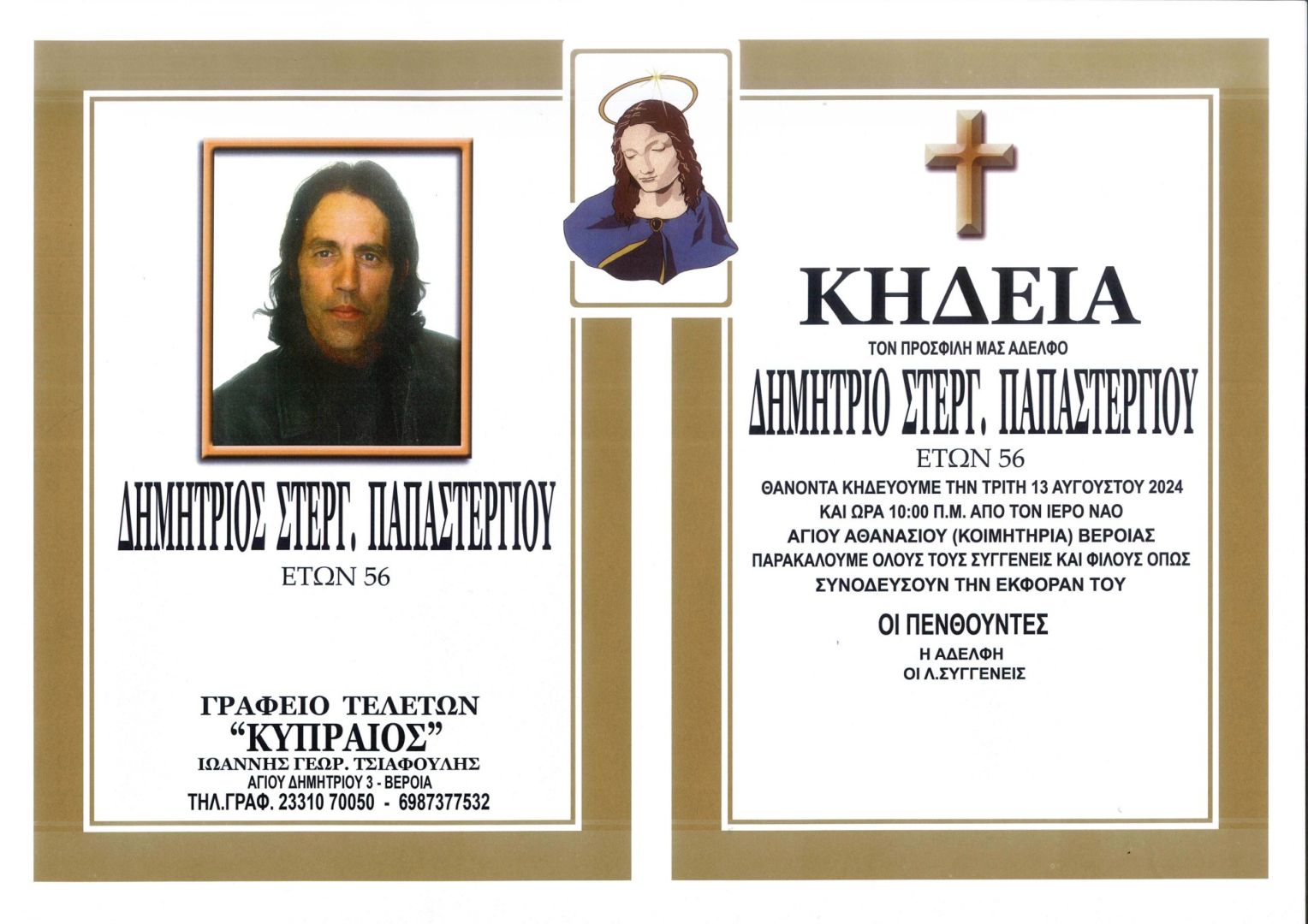 Έφυγε από τη ζωή και κηδεύεται την Τρίτη 13 Αυγούστου 2024 στις 10.00 π.μ. από τον Ιερό Ναό Αγίου Αθανασίου (Κοιμητήρια) Βέροιας ο Δημήτριος Στεργ. Παπαστεργίου σε ηλικία 56 ετών.