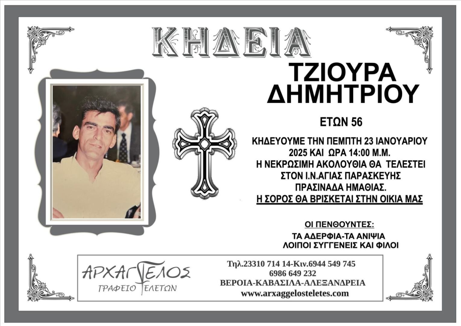 Έφυγε από τη ζωή και κηδεύεται την Πέμπτη 23 Ιανουαρίου 2025 στις 2.00 μ.μ. από τον Ιερό Ναό Αγίας Παρασκευής στην Πρασινάδα Ημαθίας ο Δημήτριος Τζιούρας σε ηλικία 56 ετών.