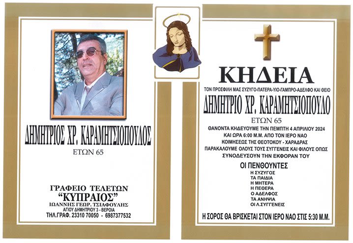 Έφυγε από τη ζωή και κηδεύεται σήμερα Πέμπτη 4 Απριλίου 2024 στις 6.00 μ.μ. από τον Ιερό Ναό Κοιμήσεως της Θεοτόκου Χαράδρας ο Δημήτριος Χρ. Καραμητσιόπουλος σε ηλικία 65 ετών.