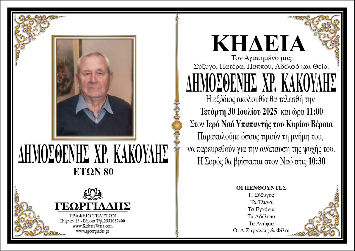 Έφυγε από τη ζωή και κηδεύεται την Τετάρτη 30 Ιουλίου 2025 στις 11.00 π.μ. από τον Ιερό Ναό Υπαπαντής του Κυρίου Βέροιας ο Δημοσθένης Χρ. Κακούλης σε ηλικία 80 ετών.