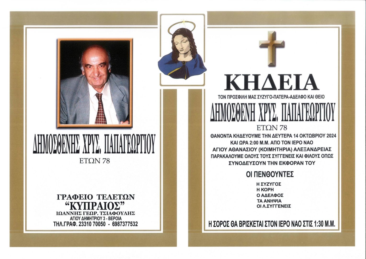 Έφυγε από τη ζωή και κηδεύεται την Δευτέρα 14 Οκτωβρίου 2024 στις 2.00 μ.μ. από τον Ιερό Ναό Αγίου Αθανασίου (Κοιμητήρια) Αλεξάνδρειας ο Δημοσθένης Χρυσ. Παπαγεωργίου σε ηλικία 78 ετών.