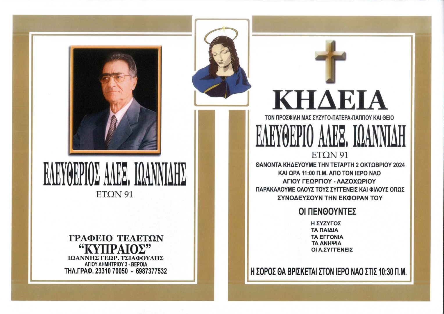 Έφυγε από τη ζωή και κηδεύεται την Τετάρτη 2 Οκτωβρίου 2024 στις 11.00 π.μ. από τον Ιερό Ναό Αγίου Γεωργίου Λαζοχωρίου ο Ελευθέριος Αλεξ. Ιωαννίδης σε ηλικία 91 ετών.