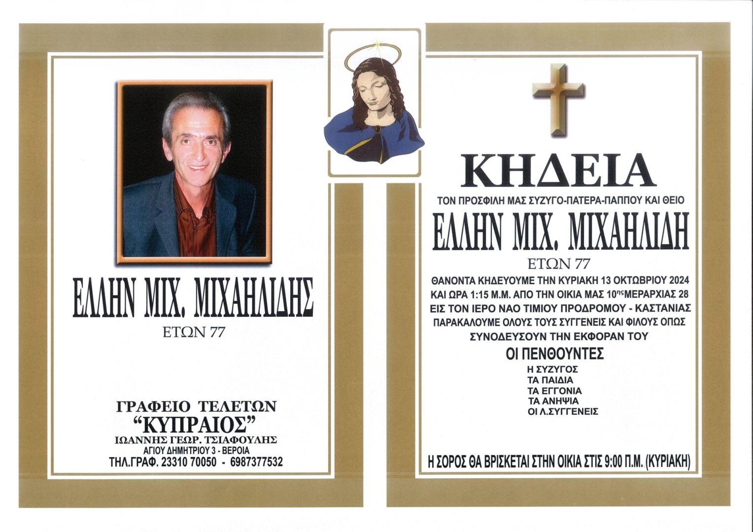 Έφυγε από τη ζωή και κηδεύεται την Κυριακή 13 Οκτωβρίου 2024 στις 1.15 μ.μ. από τον Ιερό Ναό Τιμίου Προδρόμου Καστανιάς ο Έλλην Μιχ. Μιχαηλίδης σε ηλικία 77 ετών.