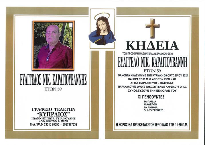 Έφυγε από τη ζωή και κηδεύεται αύριο Κυριακή 20 Οκτωβρίου 2024 στις 12.00 μ.μ. από τον Ιερό Ναό Αγίας Παρασκευής – Πατρίδας, ο Ευάγγελος Νικ. Καραγιουβάννης σε ηλικία 59 ετών.