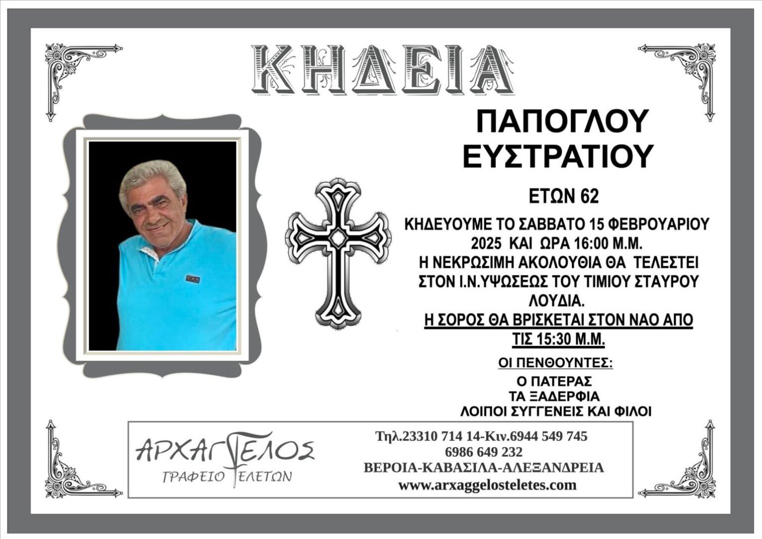 Έφυγε από τη ζωή και κηδεύεται το Σάββατο 15 Φεβρουαρίου 2025 στις 4.00 μ.μ. από τον Ιερό Ναό Υψώσεως του Τιμίου Σταυρού Λουδία ο Ευστράτιος Πάπογλου σε ηλικία 62 ετών.
