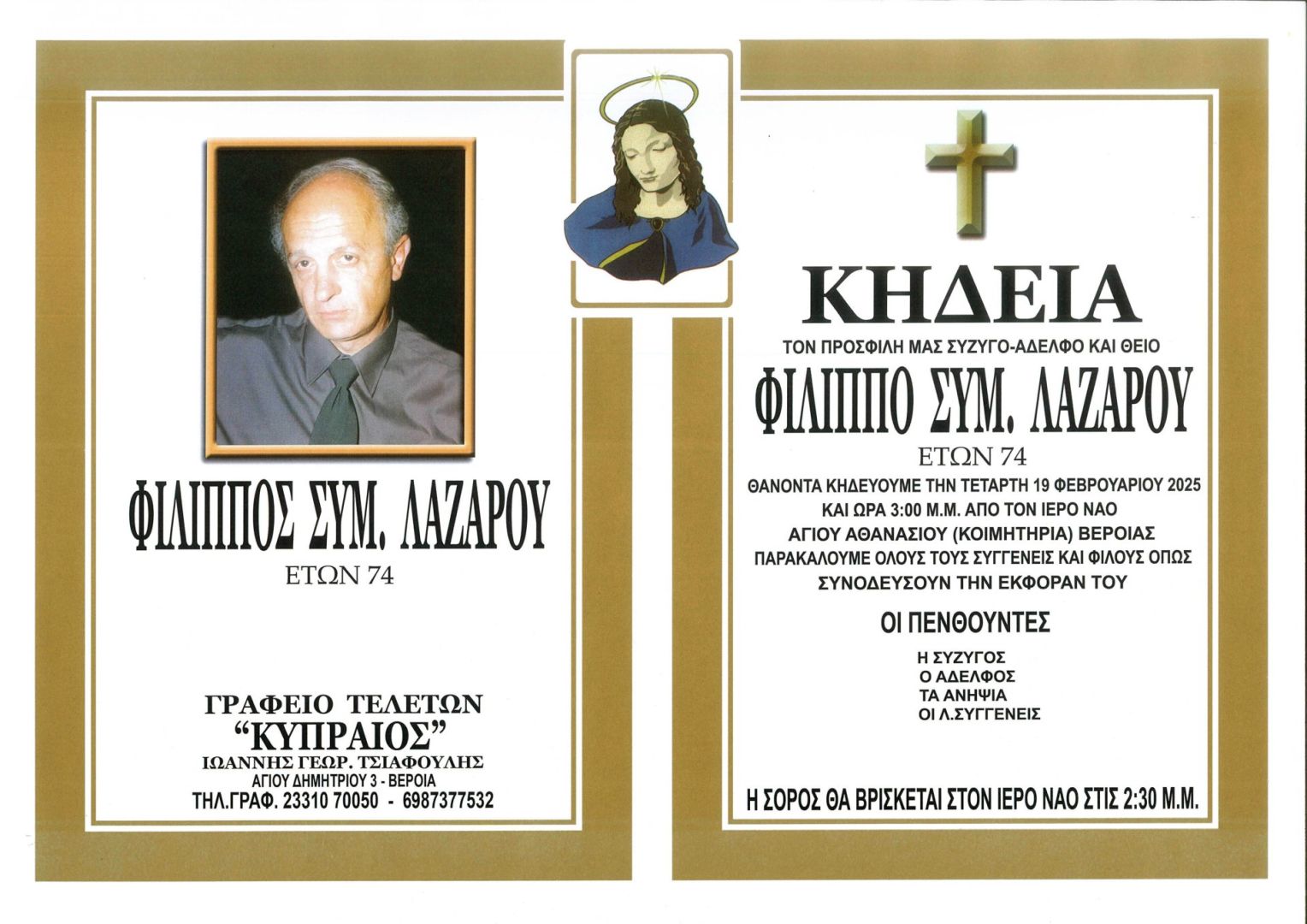 Έφυγε από τη ζωή και κηδεύτηκε σήμερα Τετάρτη 19 Φεβρουαρίου 2025 στις 3.00 μ.μ. από τον Ιερό Ναό Αγίου Αθανασίου (Κοιμητήρια) Βέροιας ο Φίλιππος Συμ. Λαζάρου σε ηλικία 74 ετών.