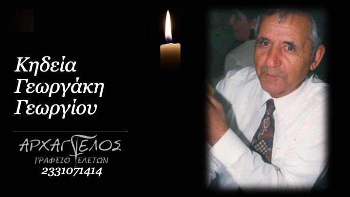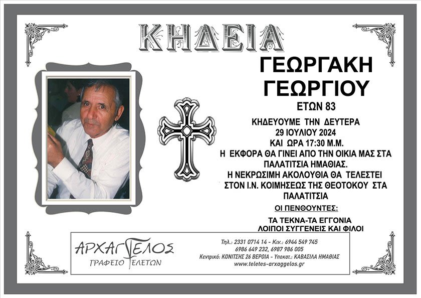 Έφυγε από τη ζωή και κηδεύεται σήμερα Δευτέρα 29 Ιουλίου 2024 στις 5.30μ.μ. από τον Ιερό Ναό Κοιμήσεως της Θεοτόκου στα Παλατίτσια, ο Γεωργάκης Γεώργιος σε ηλικία 83 ετών.